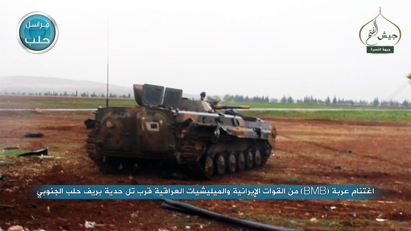 وأظهرت الصورة الأولى اغتنام جيش الفتح لدبابة “BMB” من القوات الايرانية والميليشيات العراقية في تل حدية،