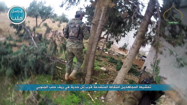 نشر "جيش الفتح" -أحد الفصائل السورية المعارضة التابعة لجبهة النصرة - صورا عبر حسابه الشخصي على موقع التواصل الاجتمعي "تويتر"، أثناء تمشيط بلدة تل حدية في ريف حلب الجنوبي بعد دحر جيش النظام السوري وميليشيا إسيران وحزب الله.