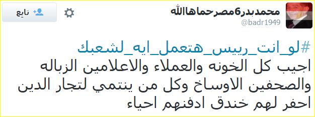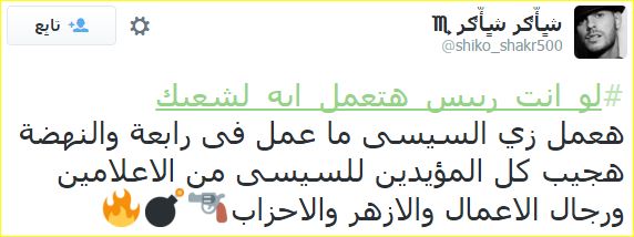 في البداية كتّب المدون “شٍأّګر شٍأّګر ♏”: “هعمل زي السيسي ما عمل في رابعة والنهضة، هجيب كل المؤيدين للسيسي من الإعلاميين ورجال الأعمال والأزهر والأحزاب”.