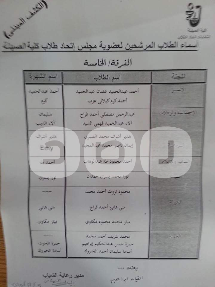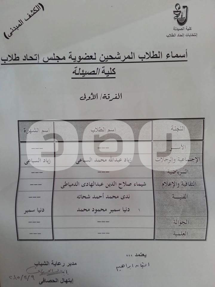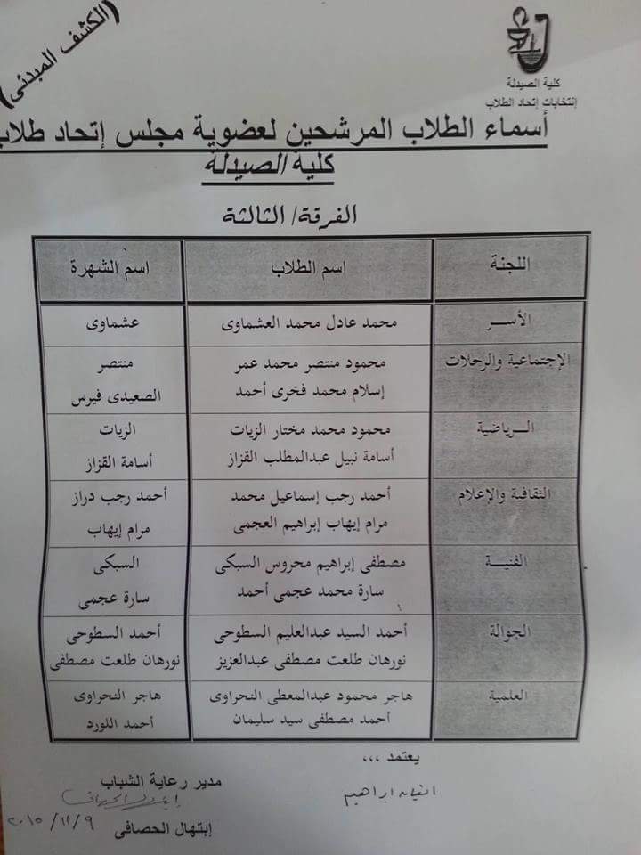 ولم تغب كلية الصيدلة عن المشهد ذاته حيث حسمت معظم مقاعد الاتحاد بالتزكية لانعدام الترشيح وتعيين أكثر من سته عشر عضوا بالاتحاد لفراغ تلك اللجان من المترشحين، كذلك جميع كليات الجامعة في ما بين انعدام الترشيح أو حسم المقاعد بالتزكية.
