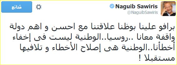 وقال ساويرس في تغريدة له عبر حسابه الشخصي على موقع التواصل الاجتماعي “تويتر”: “برافو علينا بوظنا علاقتنا مع أحسن وأهم دولة واقفة معانا.. روسيا.. الوطنية ليست في إخفاء أخطائنا.. الوطنية هي إصلاح الأخطاء وتلافيها مستقبلا!”.