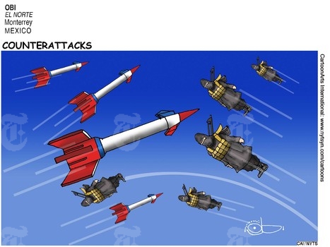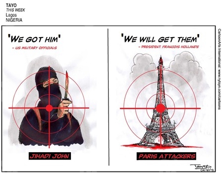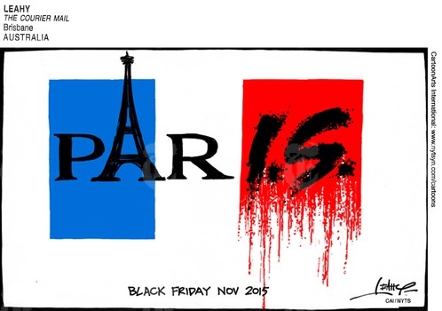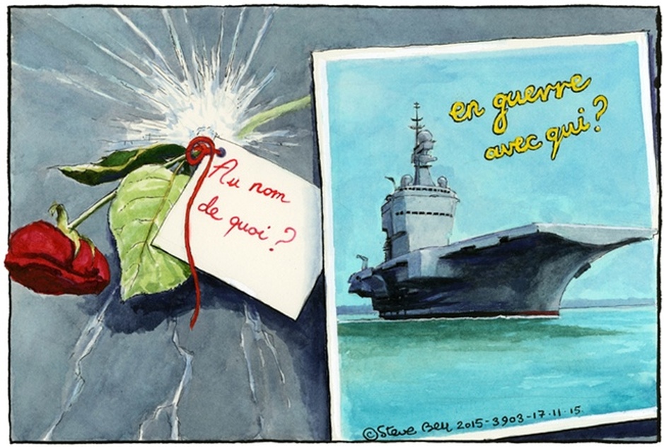 فنشر ستيف بل في صحيفة الجارديان رسما عن الهجمات التي وقعت على باريس وعن تصعيد فرنسا للحرب ضد الدولة الإسلامية إذ تعهد فرانسوا هولاند يوم الإثنين بتكثيف الضربات الجوية لبلاده ضد الجماعة الإرهابية: