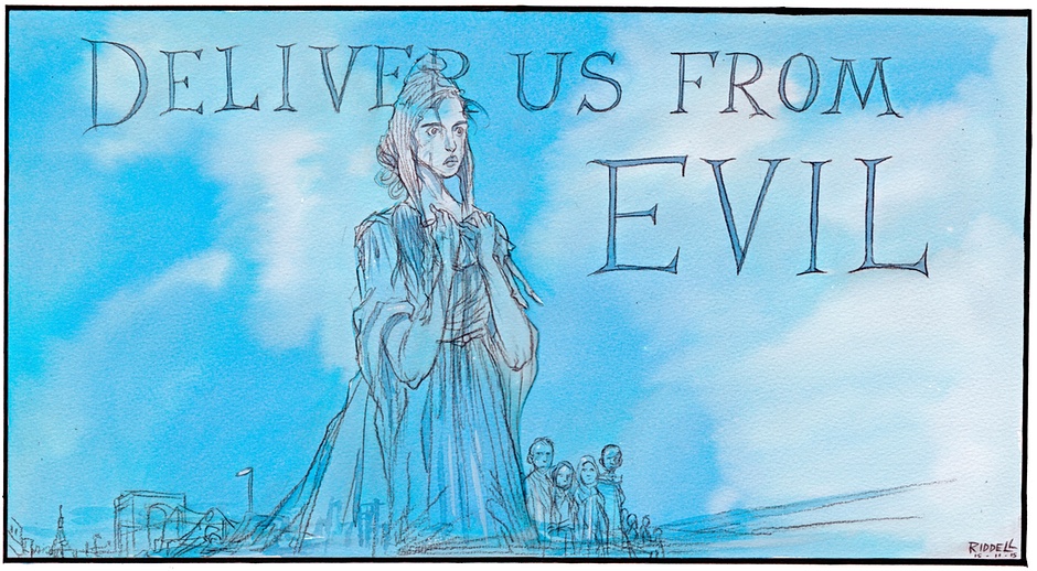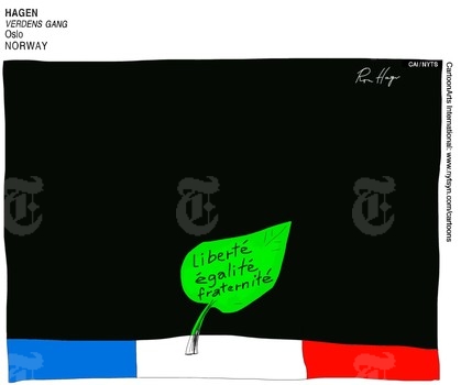 أما كريس ريدل في الجارديان، فأشار في رسمه إلى الأعمال الإرهابية في العاصمة الفرنسية من خلال هذا الرسم: