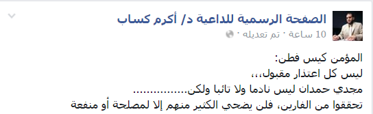 وعلق الدكتور أكرم كساب، عضو جماعة الإخوان المسلمين، عبر صفحته الرسمية، بقوله: “المؤمن كيس فطن، ليس كل اعتذار مقبول، مجدي حمدان ليس نادمًا ولا تائبًا ولكن تحققوا من الفارين، فلن يضحي الكثير منهم إلا لمصلحة أو منفعة”.