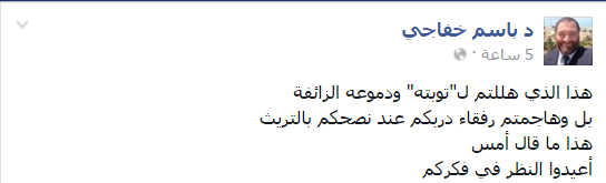 يقول باسم خفاجي، المرشح الرئاسي السابق: “هذا الذي هللتم لـ”توبته” ودموعه الزائفة.. بل هاجمتم رفقاء دربكم عند نصحكم بالتريث، هذا ما قال أمس.. أعيدوا النظر في فكركم”.