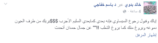وعلق خالد بدوي: “إياك وقبول رجوع السيساوي فإنه يعدي كما يعدي السليم الأجرب، يريك من طرف العيون دموعه ويروغ منك كما يروغ الثعلب”.