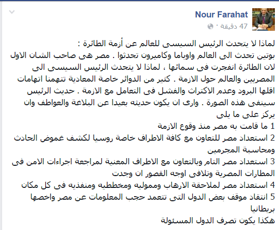أعرب الدكتور نور فرحات، أستاذ القانون بجامعة الزقازيق، عن دهشته من عدم تحدث عبدالفتاح السيسي للعالم عن أزمة الطائرة الروسية التي سقطت بسيناء، كما تحدث عدة رؤساء لدول غربية.