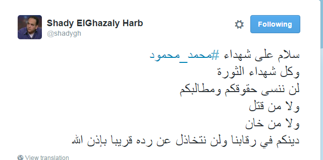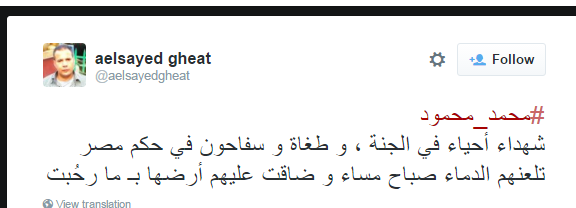 وقال aelsayed gheat: “شهداء أحياء في الجنة، وطغاة وسفاحون في حكم مصر تلعنهم الدماء صباح مساء وضاقت عليهم أرضها بـما رحُبت”.