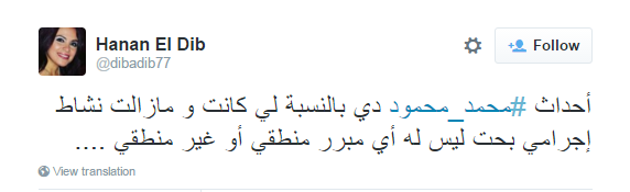 ووصفت Hanan El Dib المذبحة بقولها: “أحداث #محمد_محمود دي بالنسبة لي كانت وما زالت نشاط إجرامي بحت ليس له أي مبرر منطقي أو غير منطقي”.