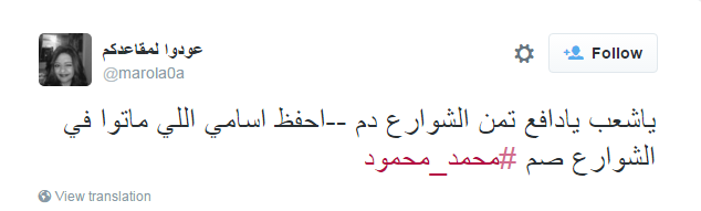 ‏وعلقت marola0: “يا شعب يا دافع تمن الشوارع دم.. احفظ أسامي اللي ماتوا في الشوارع صم”.