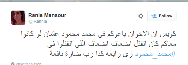 فيما غردت Rania Mansour بقولها: “كويس إن الإخوان باعوكم في محمد محمود عشان لو كانوا معاكم كان اتقتل أضعاف أضعاف اللي اتقتلوا في #محمد_محمود زي رابعة كدا رب ضارة نافعة”.