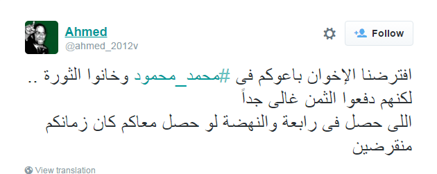 ومثلها قال Ahmed: “افترضنا الإخوان باعوكم فى #محمد_محمود وخانوا الثورة.. لكنهم دفعوا الثمن غالي جدًا.. اللي حصل في رابعة والنهضة لو حصل معاكم كان زمانكم منقرضين”.