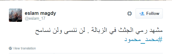 وذكر eslam magdy مشهد رمي الجثث في القمامة، والذي حدث من قبل العسكر، قائلًا: “لن ننسى ولن نسامح”.