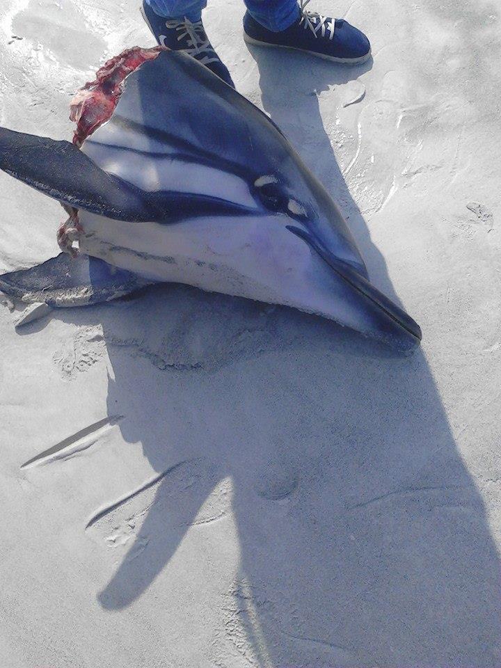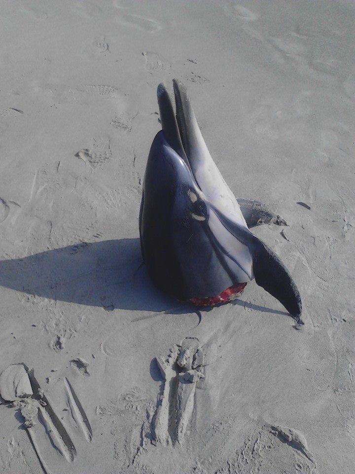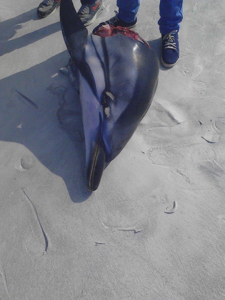 وجاء في الصور رأس دولفين مقطوع وملقى على الشاطئ ومن الواضح أنه تم قطعه بطريقة احترافية وباستخدام أدوات خاصة لذلك.