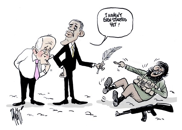 وتسعى دول العالم في الوقت الحالي لتسريع خطواتها نحو التخلص من تنظيم الدولة، وهو ما تخيله موقع “بوليتكال كارتونز” من خلال هذا الرسم: