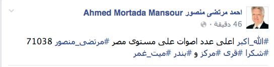 وقالت الصفحة الرسمية لأحمد مرتضى، على موقع التواصل الاجتماعي “فيس بوك”، صباح اليوم الثلاثاء: “الله أكبر.. أعلى عدد أصوات على مستوى مصر مرتضى منصور 71038.. شكرًا قرى مركز وبندر ميت غمر”.