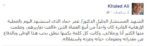 أثنى المحامي خالد علي، المرشح الرئاسي الأسبق، على المستشار الدكتور عمر حماد الذي قتل، صباح الثلاثاء، في انفجار سيارة مفخخة أمام فندق القضاة المشرفين على العملية الانتخابية بالعريش، مشيرًا إلى أنه كان واحدًا من أنبغ القضاة.