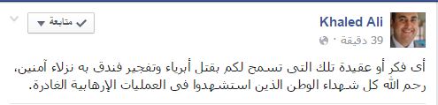 وفي تغريدة سابقة، استنكر “علي” تفجير العريش قائلاً: “أي فكر أو عقيدة تلك التي تسمح لكم بقتل أبرياء وتفجير فندق به نزلاء آمنون، رحم الله كل شهداء الوطن الذين استشهدوا في العمليات الإرهابية الغادرة”.