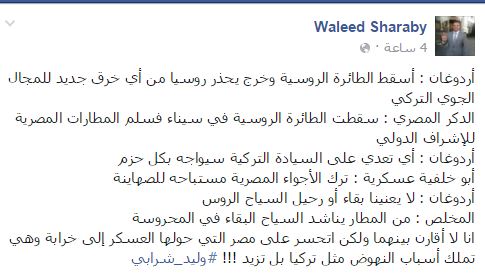 وقال شرابي عبر “فيس بوك”: “أردوغان أسقط الطائرة الروسية وخرج يحذر روسيا من أي خرق جديد للمجال الجوي التركي، الدكر المصري سقطت الطائرة الروسية في سيناء فسلم المطارات المصرية للإشراف الدولي”.
