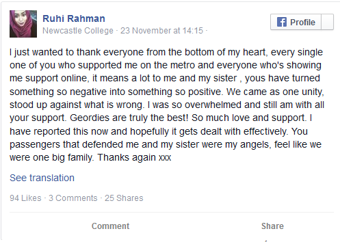 وفوجئت روحي رحمان البالغة من العمر 23 عامًا حين بدأ الرجل بمهاجمتها بكلام عدواني غير مبرر، حين جلست مع أختها في مترو مدينة نيوكاسل مساء السبت الماضي.