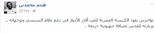 وكتب “محمدين” في منشور له عبر صفحته الرسمية على موقع “فيس بوك”: “تواضروس يقود الكنيسة المصرية للعب أقذر الأدوار في دعم نظام السيسي وتوجهاته.. وزيارته للقدس بضيافة صهيونية جريمة”.