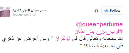 وقال queen perfume: “#قرب_من_ربنا_عشان الله سبحانه وتعالي قال في #القرآن “ومن أعرض عن ذكري فإن له معيشة ضنكًا”.