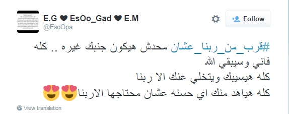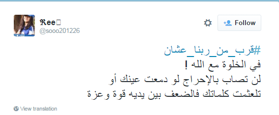وعن تغريدات بعض الرواد، رأت صاحبة حساب sooo #قرب_من_ربنا_عشان ﻓﻲ ﺍﻟﺨﻠﻮﺓ ﻣﻊ ﺍﻟﻠﻪ! ﻟﻦ ﺗﺼﺎﺏ ﺑﺎﻹﺣﺮﺍﺝ ﻟﻮ ﺩﻣﻌﺖ ﻋﻴﻨﻚ ﺃﻭ ﺗﻠﻌﺜﻤﺖ ﻛﻠﻤﺎﺗﻚ ﻓﺎﻟﻀﻌﻒ ﺑﻴﻦ ﻳﺪﻳﻪ ﻗﻮﺓ ﻭﻋﺰﺓ”.