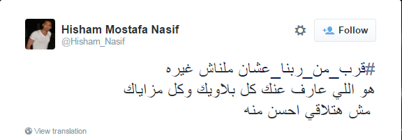 وغرد Hisham Mostafa Nasif: “#قرب_من_ربنا_عشان ملناش غيره هو اللي عارف عنك كل بلاويك وكل مزاياك، مش هتلاقي أحسن منه”.