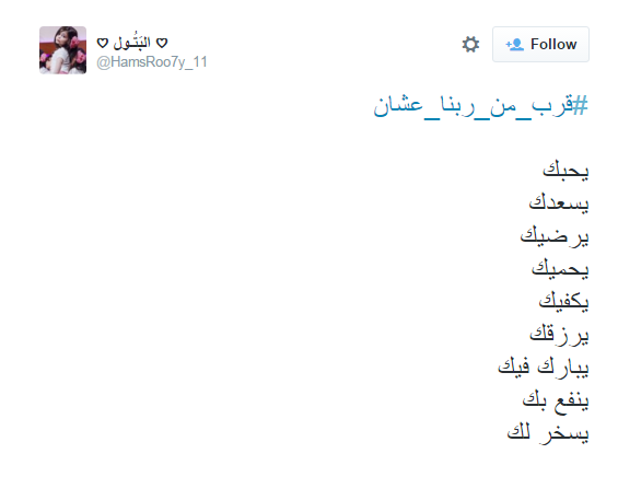 وقالت HamsRoo7y: “#قرب_من_ربنا_عشان يحبك ويسعدك ويرضيك ويحميك ويكفيك ويرزقك ويبارك فيك وينفع بك ويسخر لك”.