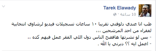 وقال -عبر منشور له على “فيس بوك”-: “طب أنا عندي دلوقتي تقريبا ١٠ ساعات تسجيلات فيديو لرشاوى انتخابية لفقراء من أحد المرشحين، بس لو نشرتها هافضح الناس دول اللي الفقر عمل فيهم كده، أعمل إيه؟؟ دبرني يا الله”.