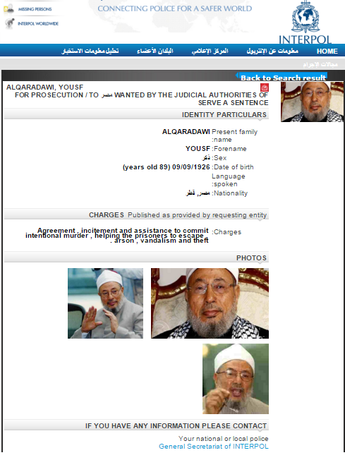 ووضع الإنتربول في الخامس من ديسمبر من العام الماضي نشرة حمراء بحق عدد من قيادات ورموز جماعة الإخوان المسلمين، أبرزهم الشيخ القرضاوي الحامل للجنسيتين المصرية والقطرية، وجاء إصدار تلك النشرة بناءً على طلب من السلطات المصرية.