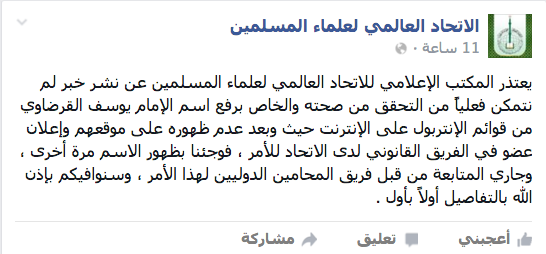 وقالت عدة مواقع إخبارية: إن الاتحاد العالمي لعلماء المسلمين أصدر بيانًا أكد فيه رفع اسم الدكتور القرضاوي من قوائم الترقب، وهو ما نفاه الاتحاد”.
