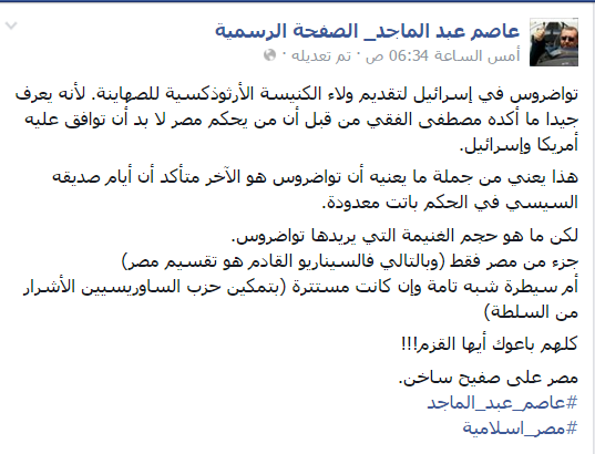 وقال -عبر منشور له على “فيس بوك”-: “تواضروس في إسرائيل لتقديم ولاء الكنيسة الأرثوذكسية للصهاينة؛ لأنه يعرف جيدًا ما أكده مصطفى الفقي من قبل أن من يحكم مصر لا بد أن توافق عليه أميركا وإسرائيل”.