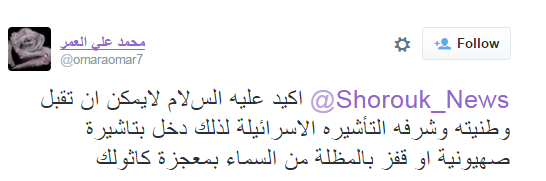 وسخر محمد علي العمر: “أكيد عليه السلام ﻻ يمكن أن تقبل وطنيته وشرفه التأشيرة الإسرائيلية لذلك دخل بتأشيرة صهيونية أو قفز بالمظلة من السماء بمعجزة”.