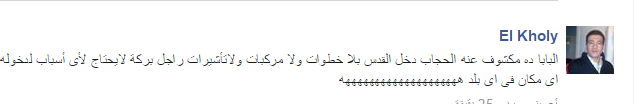يقول El Kholy: “البابا ده مكشوف عنه الحجاب دخل القدس بلا خطوات ولا مركبات ولا تأشيرات راجل بركة لا يحتاج لأي أسباب لدخوله أي مكان في أي بلد”.