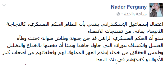 واعتبر نادر فرجاني، أستاذ العلوم السياسية بجامعة القاهرة، أن “اعتقال إسماعيل الإسكندراني يشي بأن النظام الحكم العسكري، كالدجاجة الذبيحة، يعاني من تشنجات الانقضاء”.
