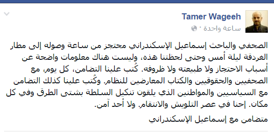 وأعلن الكاتب الصحفي والناشط الاشتراكي، تامر وجيه، تضامنه مع إسماعيل الإسكندراني، قائلًا: إنه “محتجز من ساعة وصوله إلى مطار الغردقة ليلة أمس وحتى لحظتنا هذه، وليست هناك معلومات واضحة عن أسباب الاحتجاز ولا طبيعته ولا ظروفه”.