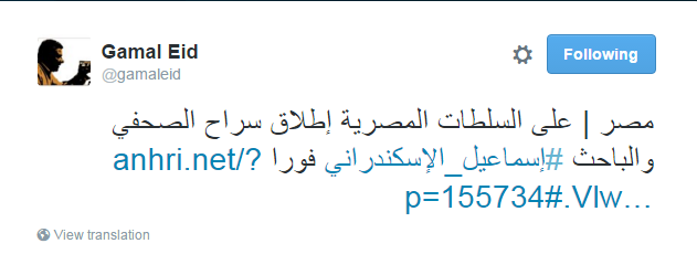 وقال الناشط الحقوقي جمال عيد: “على السلطات المصرية إطلاق سراح الصحفي والباحث #إسماعيل_الإسكندراني فورًا”.
