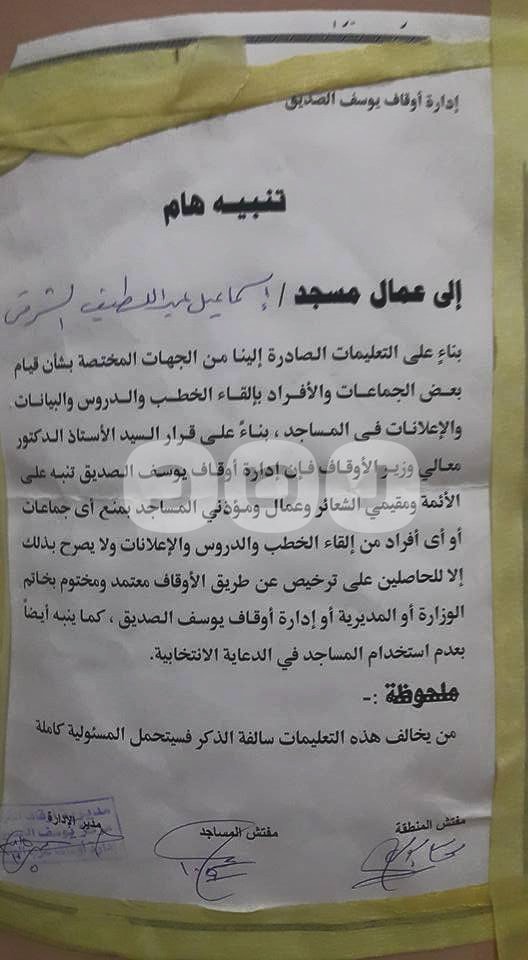 وقالت في بيان لها: “تنبه إدارة أوقاف يوسف الصديق على الأئمة ومقيمي الشعائر والعمال بمنع أي فرد أو جماعة من إلقاء الخطب والدروس، ولا يصرح بذلك إلا لحاملي الترخيصات المعتمدة والمختومة من مديرية الأوقاف”.
