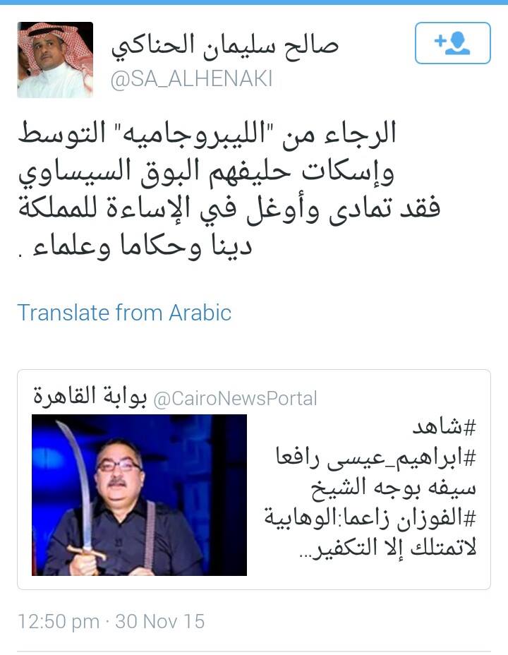 ونشر “الحناكي” تغريدة عبر موقع التغريدات القصيرة “تويتر” قال فيها: “الرجاء من “الليبروجامية” التوسط وإسكات حليفهم البوق السيساوي فقد تمادى وأوغل في الإساءة للمملكة دينا وحكاما وعلماء”.