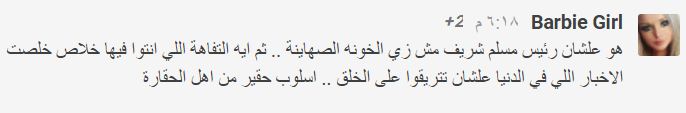 وعلقت مدونة: “هو علشان رئيس مسلم شريف مش زي الخونة الصهاينة.. ثم إيه التفاهة اللي إنتم فيها خلاص خلصت الأخبار اللي في الدنيا علشان تتريقوا على الخلق.. أسلوب حقير من أهل الحقارة”.