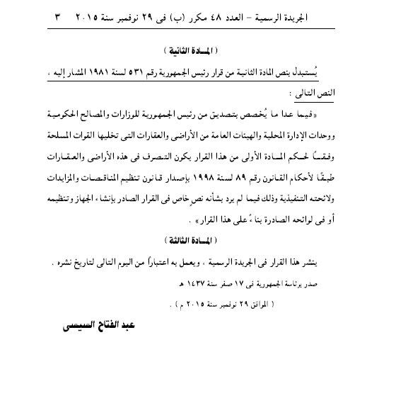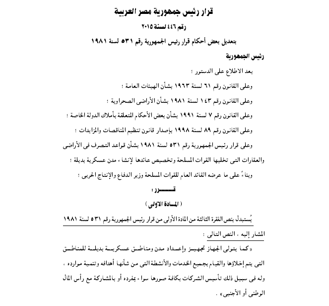 نشرت الجريدة الرسمية لجمهورية مصر العربية، قرارا جمهوريا أصدره عبدالفتاح السيسي برقم 446 لسنة 2015، لتنظيم قواعد التصرف في الأراضي والعقارات التي تخليها القوات المسلحة، وتخصيصها لإنشاء مناطق عسكرية بديلة.