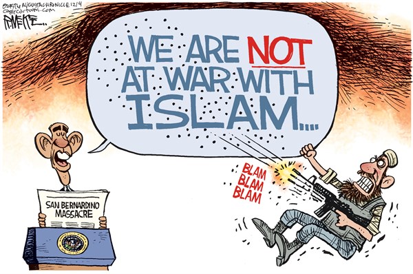 ونشر “كاجل” أيضا هذا الرسم عن أوباما وهو يقول معلقا على مذبحة سان بيرناردينو التي وقعت مؤخرًا في أميركا وأسفرت عن مقتل 14 شخصًا: إنه ليس في حرب مع الإسلام فيما يقوم مسلح ملتح بإطلاق النار على ما يقوله الرئيس الأميركي: