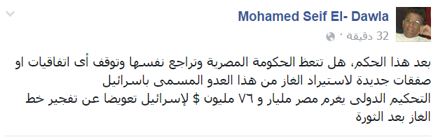 من جانبه، ندد محمد سيف الدولة، الباحث المتخصص في الشأن القومي العربي، بتغريم مصر مليارًا و٧٦ مليون دولار لإسرائيل؛ تعويضًا عن تفجير خط الغاز بعد الثورة.