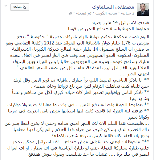 وأضاف -عبر “فيس بوك”- “بذكر الناس وبقولهم تصدير الغاز كان خيانة كبرى لكل من ساهم وأنشأ وشهد زورًا، عملوها الخونة واحنا هندفع الثمن… في وقت ما معانا لا جنيه ولا دولارات”.