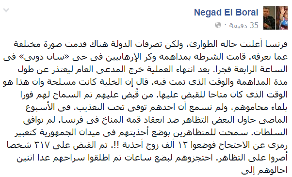 قارن الناشط الحقوقي، نجاد البرعي، بين إعلان حالة الطوارئ في مصر وفرنسا، عقب الأحداث الإرهابية، مشيرًا إلى أن تصرفات الأخيرة قدمت صورة مختلفة عما نعرفه في مصر.