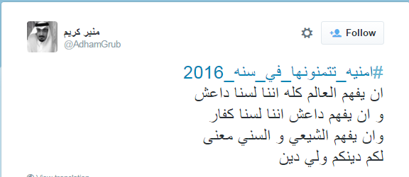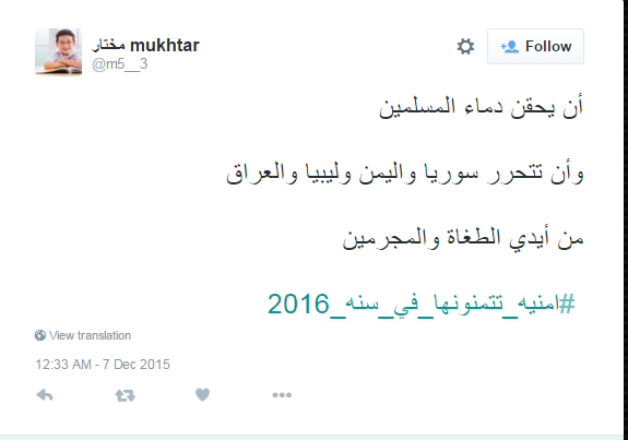 تصدر #امنيه_تتمنونها_في_سنه_2016 قائمة الأعلى تداولًا عبر "تويتر"، صباح اليوم الإثنين، سجل المغردون خلاله أمنياتهم لعام 2016، وكانت جميعها تمنيات للعالم العربي والإسلامي ونصرة دول الربيع العربي، وأن يعم السلام وينتصر المسلمون