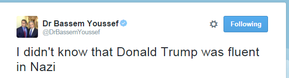 وقال باسم يوسف -في تغريدة باللغة الإنجليزية على “تويتر”، صباح اليوم الثلاثاء-: “لم أكن أعلم أن دونالد ترامب يجيد النازية”.