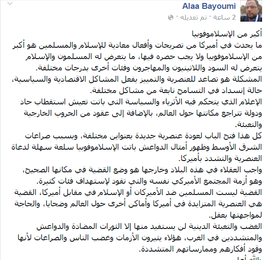 وأوضح “بيومي” أن “القضية ليست المسلمين ضد الأميركان أو الإسلام في مقابل أميركا، القضية هي العنصرية المتزايدة في أميركا وأماكن أخرى حول العالم وضحايا، والحاجة لمواجهتها بعقل”.