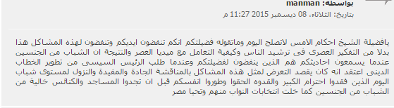 manman : “يافضيلة الشيخ أحكام الأمس لاتصلح اليوم وماتقوله فضيلتكم انكم تنفضون أيديكم وتنفضون لهذه المشاكل هذا بدلا من التفكير العصري في ترشيد الناس وكيفية التعامل مع ميديا العصر، والنتيجة أن الشباب من الجنسين عندما يسمعون أحاديثكم هم الذين ينفضون لفضيلتكم وعندما طلب الرئيس السيسى من تطوير الخطاب الديني اعتقد أنه كان يقصد التعرض لمثل هذه المشاكل بالمناقشة الجادة والمفيدة والنزول لمستوى شباب اليوم الذين فقدوا احترام الكبير والقدوة الحقوا وطوروا انفسكم قبل أن تجدوا المساجد والكنائس خالية من الشباب من الجنسين كما خلت انتخابات النواب منهم وتحيا مصر”.